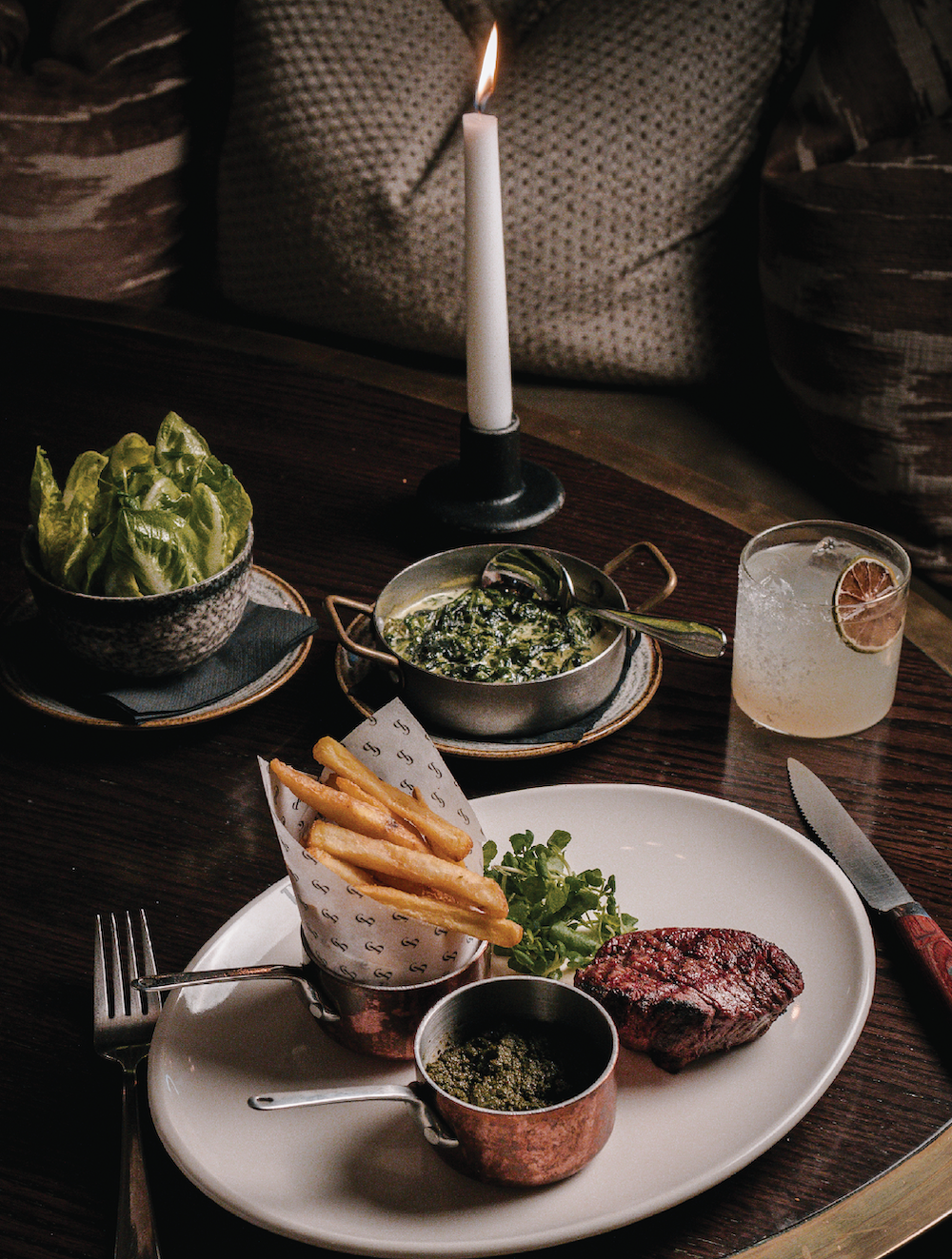 £22 - steak, fries and creamed spinach or salad